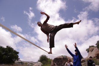 The members of team YogaSlackers have collectively taught over 20, 000 people (from 6 to 82 yrs old) to successfully embrace this form of amazing asana. They have developed a special line and simple tensioning system, allowing for practitioners to learn safely and experience the benefit of a wide range of dynamic energies while on the line. They have also created a comprehensive DVD teaching slackline yoga to those unable to attend a workshop.