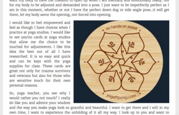 In 2012, she began marketing the Yoga flipchip, a pastel-color disk, made of canvas or bamboo, that says "assist" on one side and "no hands-on assist" on the other. She now sells packs of 20, 30, or 60 flipchips to studios around the country.