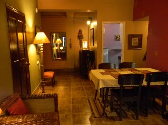 2 bedrooms – Vajrayana ( double ) & Mahayana ( Twin ) with attached baths & walk – in – closets, Split Air – con, Flat Screen TV with cable, Buddha Lounge ( living & dining space ), Bonsai Zen Garden & a fully equipped guest kitchen.