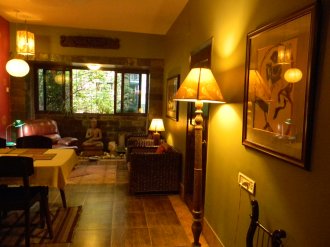 Theme : Classic Contemporary – a smart modernist theme with the best of Indian art and artifacts; Twin beds with spring mattress, attached bath & walk – in – closet, safe, Split Air – con, Flat screen TV with cable, shared Buddha Lounge, Bonsai Zen Garden & guest kitchen.