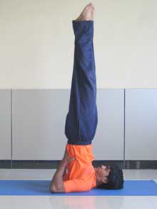 One should concentrate on getting the legs, waist and the back in one straight line and making this line 90 degrees with the ground. In this asana the arms up to the elbows are placed on the floor, shoulder width apart. The body from the feet to the shoulders is in a straight line. The chest is pushed forward and the chin is placed in the throat pit / jugular notch forming a tie which is called 'Jalandhar Bandha'. All the pressure is on the neck, shoulders and the back of the head. The hands are placed on the back ribs, the legs are straight and the feet are relaxed.