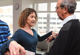 Veteran Brendan Conaway learns from Kristi Rieitz how practicing mindful awareness positively impacts stress and pain management