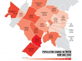 Virginia counties, such as Frederick, Spotsylvania, and Stafford, are expected to have the most growth over the next 35 years. Data from US Census Bureau, UVA Cooper Center, and Maryland Department of Planning.
