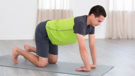 From tabletop position, place your palms down, fingers forward and rooting down through the bases of your index fingers. Curl your toes under, lift your hips up and back, and move into downward facing dog. Bend your knees enough that your sitting bones can tip up and back, and your lower back can curve in toward your belly. Now take several small jumps in place, as if you are springing over a jump rope, being careful to maintain your lumbar curve and to land softly, with knees bent and tracking toward your middle toes. If this is going well, for more intensity, make your hops bigger, into “donkey kicks, ” moving the heels toward the sitting bones.