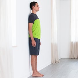 Continue to stand tall, with your back against a wall. Look at something near you, then at something far away. Look right, then left. Up, then down. Circle your eyes in one direction, and then the other. After several breaths, shut your eyes and repeat these eye movements behind your closed lids. Then allow your closed eyes to be still. Imagine the muscles around your eyes smoothing out, the muscles behind your eyes smoothing out, even your brain itself unwrinkling.