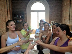 Bride-to-be Amanda Merrill celebrated her bachelorette party in August with a champagne toast at Epic Yoga in Dupont Circle. More bridal parties are practicing yoga to get in shape and relax before the big day. (Courtesy of Sarah Stout)