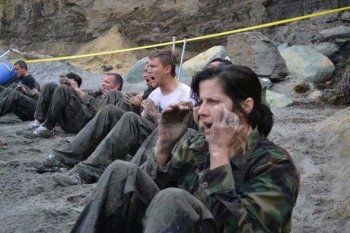 After participants are ranked and placed into groups, they spend 45 minutes hauling a giant log around the beach and completing relay races.